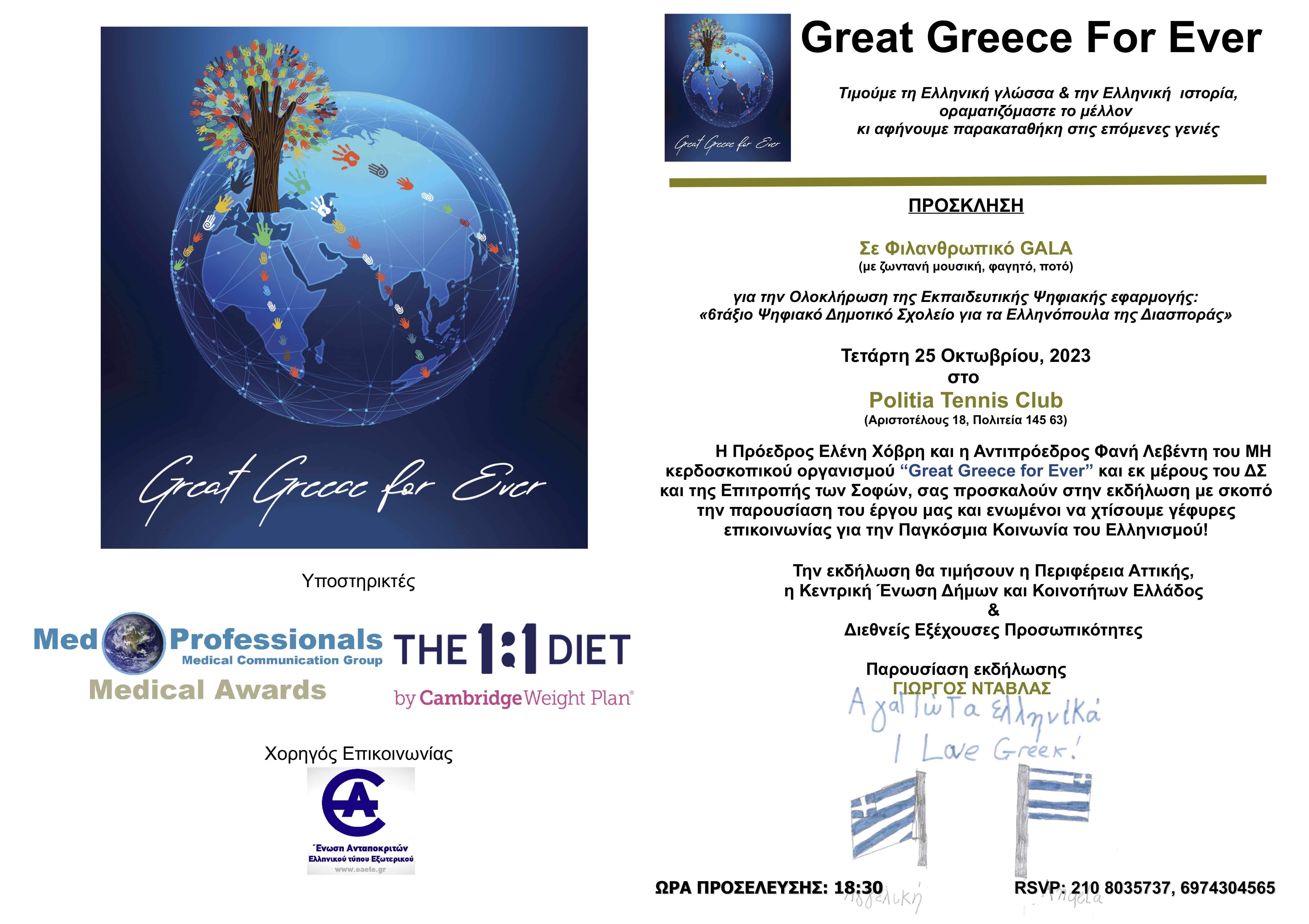 As President & Ambassador of the NON-profit organization “Great Greece for Ever” we invite you to this charity event in order to make our vision of the Educational Digital Application for Distance Learning: "6th Grade Digital Primary School for Diaspora Greek Children" known to you and to build together bridges of communication for the World Society of Greeks! - HELEN HOVRIS